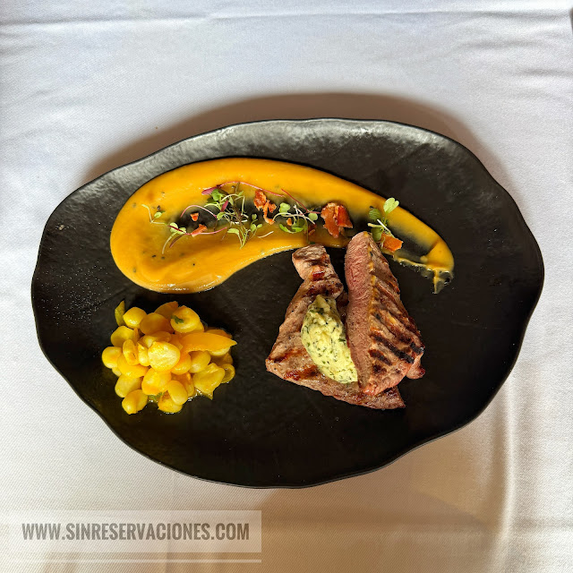 - Alpaca con Mantequilla al Wasabi, acompañada de Puré de Camote, un toque de Tocino y Saltadito de Choclo al Ají Amarillo: S/69